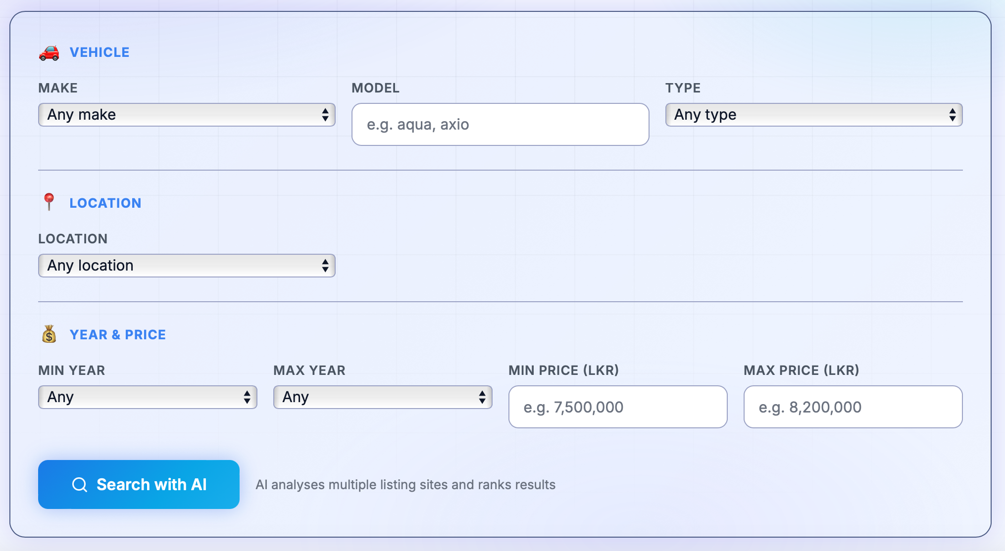 LESI Search moves beyond traditional listing platforms by using AI to aggregate vehicle listings from multiple Sri Lankan marketplaces and analyze critical factors such as price, condition, features, and ownership history. It then evaluates and ranks the most suitable options, allowing users to make smarter, faster, and more informed decisions when purchasing a vehicle.