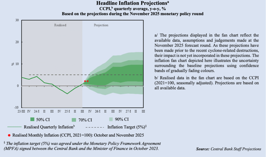 Sri Lanka’s headline inflation, as measured by the Colombo Consumer Price Index (CCPI, 2021=100), remained unchanged at 2.1% year-on-year in November 2025, maintaining the same level recorded in October 2025, according to data released by the Department of Census and Statistics. The stabilization comes despite varied dynamics across food and non-food categories. Food inflation decelerated to 3.0%,… Read more: CCPI Inflation Holds Steady at 2.1% in November 2025 Amid Mixed Sector Movements - Sri Lanka Appeals for International Aid as Floods Deepen Economic Strain