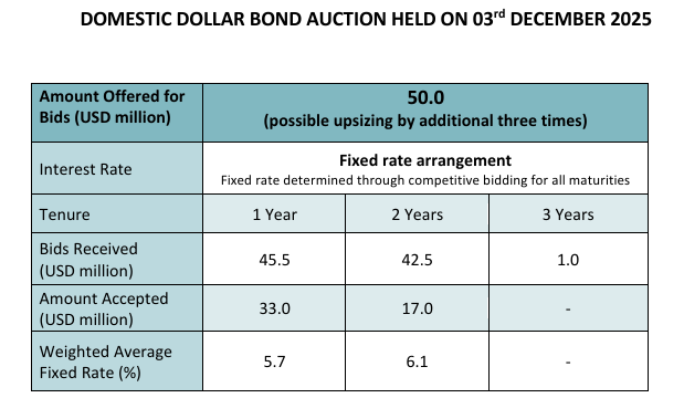 In a recent domestic dollar bond auction held on December 3, 2025, the government offered a total of USD 50 million, with the possibility of upsizing the amount by an additional three times. The auction attracted significant interest from investors, reflecting a robust demand for fixed-rate securities in the current economic climate.
