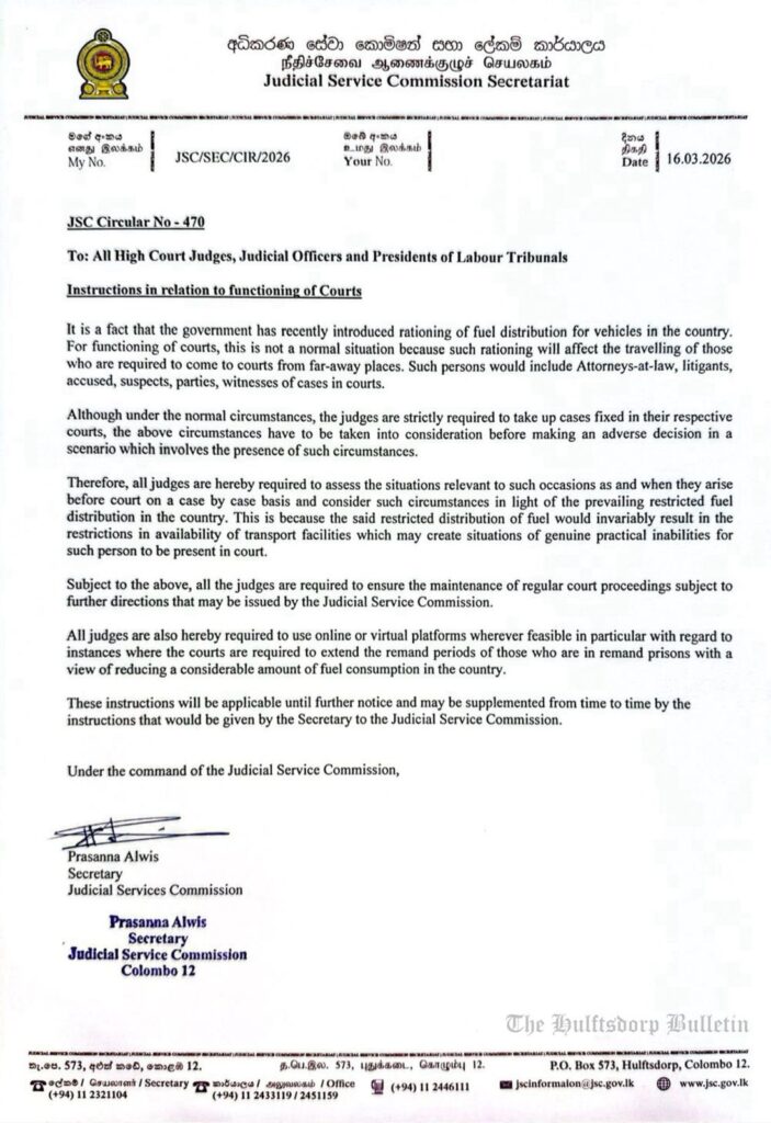 In JSC Circular No. 470 dated 16 March 2026, addressed to High Court Judges, Judicial Officers, and Presidents of Labour Tribunals, the Commission acknowledged that the restricted distribution of fuel is likely to disrupt the ability of litigants and other participants to travel to courts.