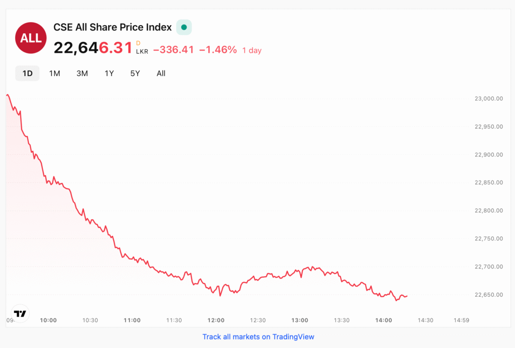 The Colombo Stock Exchange reacted swiftly and negatively to the news. The All-Share Price Index (ASPI) plunged by 338.72 points, a fall of 1.47 percent, closing at 22,644.31. The decline marks one of the steepest single-day losses in recent weeks and follows a 2.1 percent drop over the past week as sentiment had already begun to soften. Trading floors reported broad-based selling, particularly in financial stocks, which have been under pressure in recent sessions. The market has also been trading at a relatively high valuation, with the current price-to-earnings multiple around 10.4 times, noticeably higher than the three-year average of 8.5 times. This elevated pricing contributed to selling pressure as investors reassessed the risk–reward balance in the face of shifting capital flows.