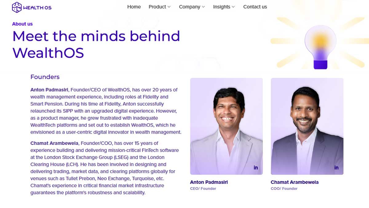 WealthOS was established by Anton Padmasiri, a financial professional with extensive expertise in wealth management. Padmasiri has previously contributed to the relaunch of a self-invested pension fund (SIPP) during his tenure at Fidelity financial group. The firm was co-founded by Chamat Arambewela, who has experience in financial market infrastructure from his work at the London Stock Exchange Group.