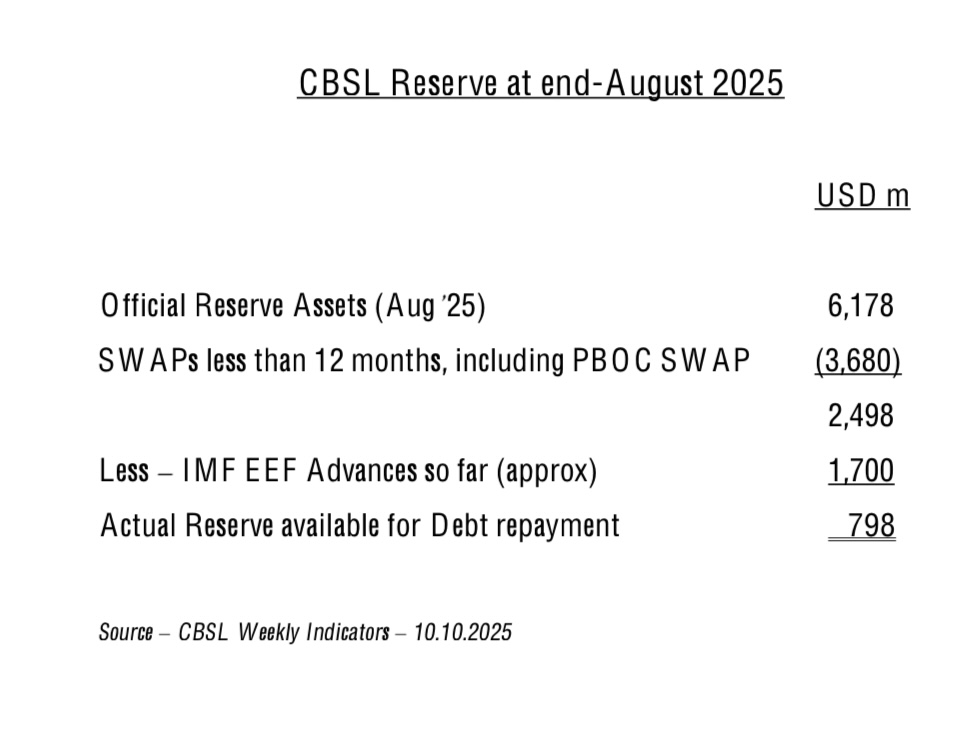 Sri Lanka’s external reserve position at end-August 2025 appears significantly weaker than headline figures suggest. Although the CBSL reported official reserve assets of USD 6.18 billion, a large portion consists of short-term SWAP arrangements USD 3.68 billion, including the PBOC swap which must be excluded when assessing usable reserves. After adjusting for these liabilities, the net balance falls to USD 2.50 billion. Furthermore, once IMF Extended Fund Facility (EFF) advances already disbursed (approximately USD 1.70 billion) are deducted, the actual reserve stock available for external debt repayment is only about USD 798 million. This highlights Sri Lanka’s continued vulnerability to external financing pressures despite reported improvements in gross reserves, underscoring the need for stricter reserve management and timely debt restructuring progress.