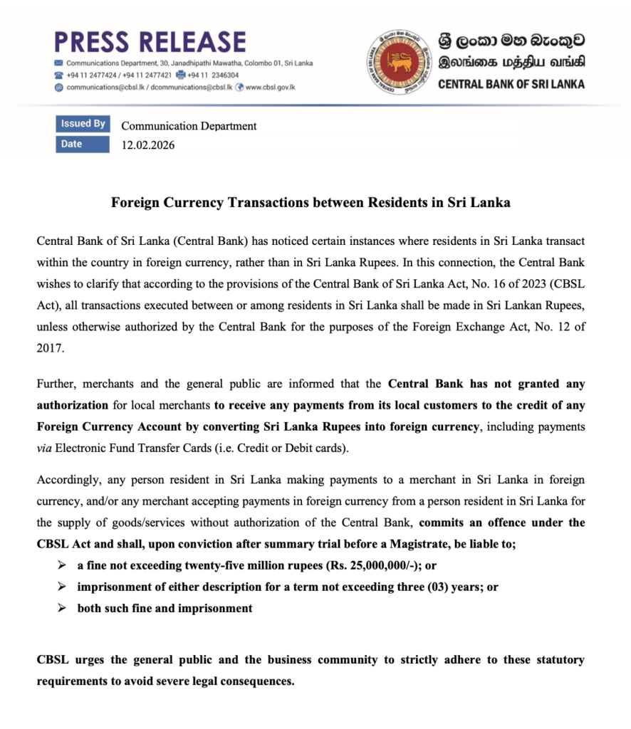 The Central Bank’s statement makes clear that unless explicitly authorized, these practices are now considered unlawful between resident Sri Lankans