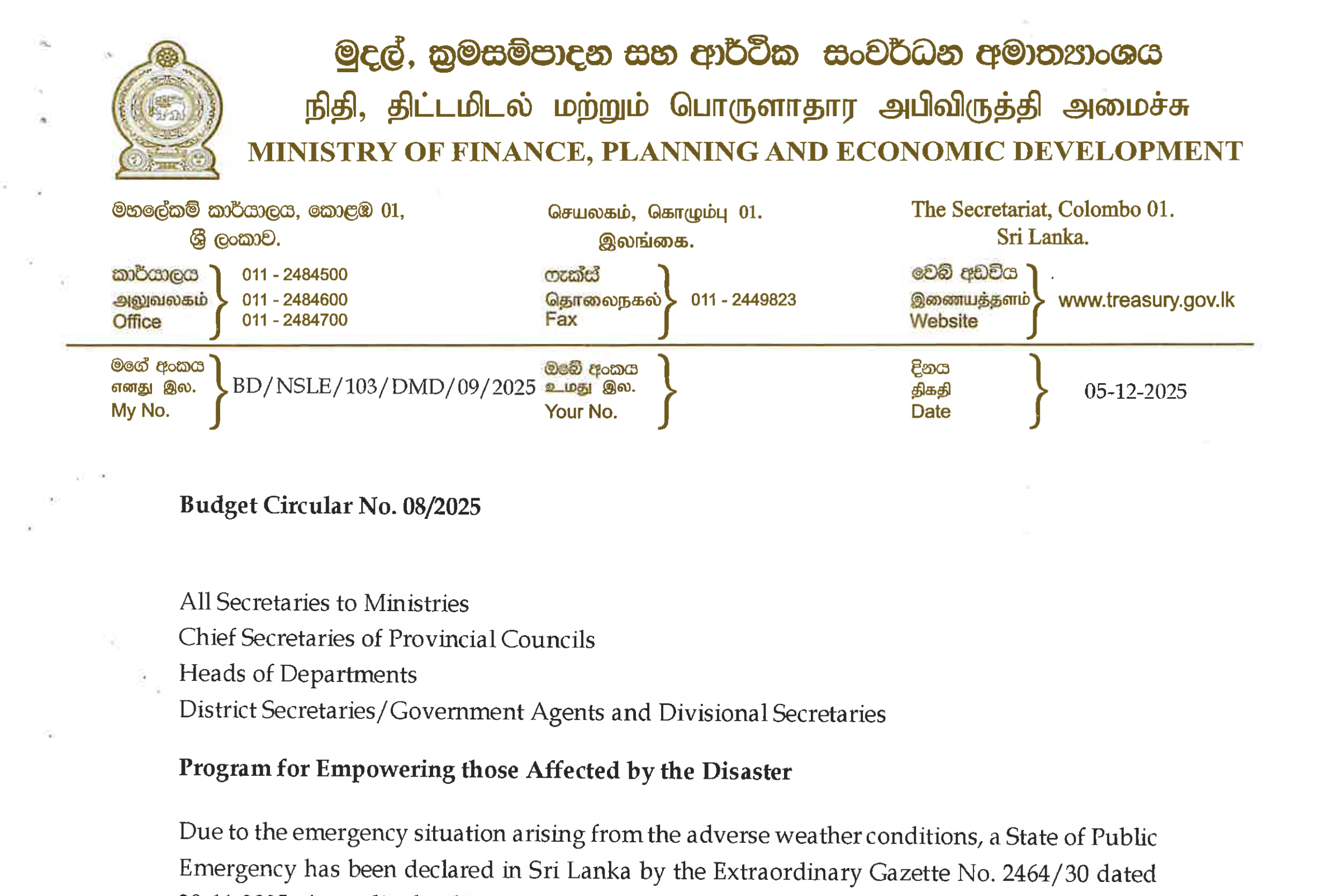 The Ministry of Finance, Planning and Economic Development has issued Budget Circular No. 08/2025 introducing an extensive relief and empowerment program for families and sectors affected by the recent disaster declared under Gazette Extraordinary No. 2464/30 on 28 November 2025. The program includes multiple cash allowances aimed at supporting devastated households, farmers, fisheries, schools and small businesses, with payments commencing from December 2025.