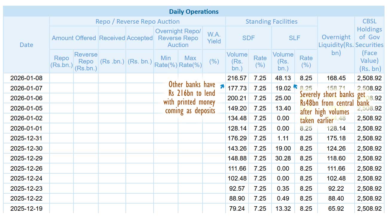 Central bank lending to banks in Sri Lanka surged to 48 billion rupees on January 8, up from 19 billion rupees the previous day, according to official data. Market participants indicated that state banks are experiencing a severe cash shortage.