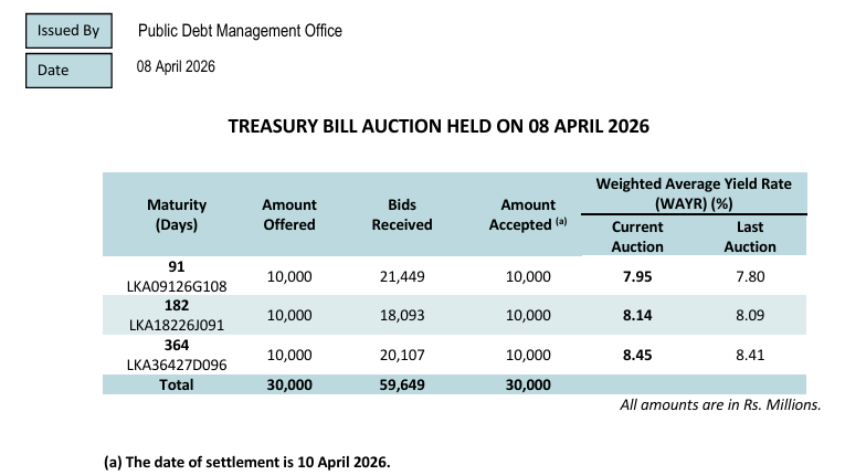 On April 8, the debt management office successfully raised 30 billion rupees through the issuance of 3-month, 6-month, and 12-month treasury bills. The settlement date for this issuance is set for April 10, 2026. (Colombo/Apr10/2026)