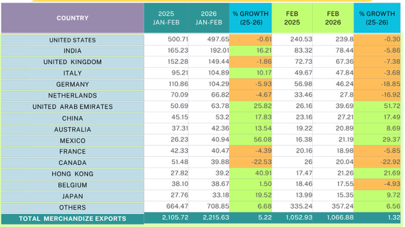 India emerged as the second-largest export destination, surpassing the United Kingdom, with exports rising 16.21 percent to 192.01 million dollars in February 2026. In contrast, exports to the United Kingdom fell by 1.86 percent to 149.44 million dollars compared with February 2025.