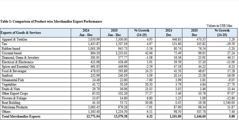Sri Lanka’s merchandise exports experienced a growth of 6.32% in 2025, reaching a total of $13,579.38 million compared to the previous year. This increase was primarily driven by the sectors of boat building, coconut, and apparel exports, according to data released by the export promotion office.