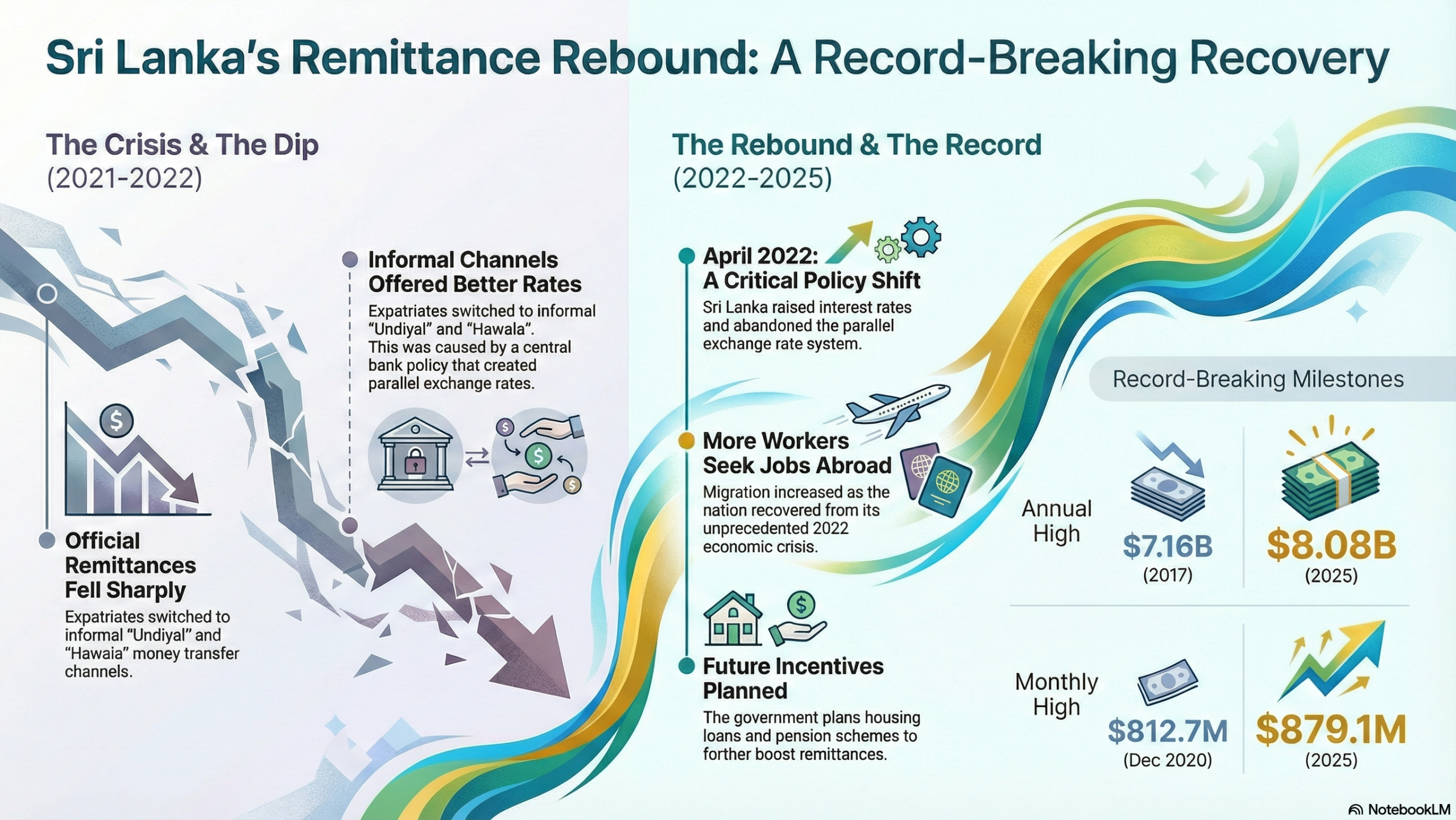 The remittances in December 2025 exceeded the previous monthly record of US$812.7 million set in December 2020. The last annual record high for remittances was US$7,164 million in 2017. This increase in worker remittances follows a significant number of Sri Lankan workers seeking employment abroad as the country recovers from the severe economic crisis of 2022.