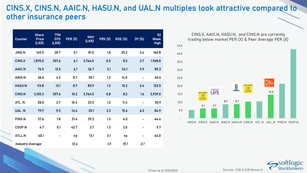 Listed insurance companies posted mixed profitability, with Ceylinco (CINS) recording the highest equity holders’ profit of LKR 5.4 billion for 9M2025, while Softlogic Life delivered strong GWP growth and the highest new policy additions among peers. Union Assurance and HNB Assurance recorded healthy premium growth, though profitability was affected by higher reserve requirements and rising claims.