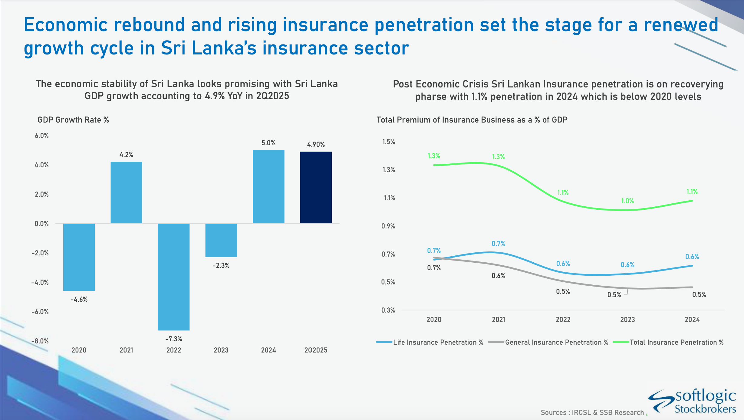Despite the positive trajectory, Sri Lanka’s insurance penetration—at 1.1% of GDP in 2024—remains below pre-crisis levels and significantly lower than regional peers. Premium income per capita stands at approximately USD 54, indicating a substantial untapped market with long-term growth potential.