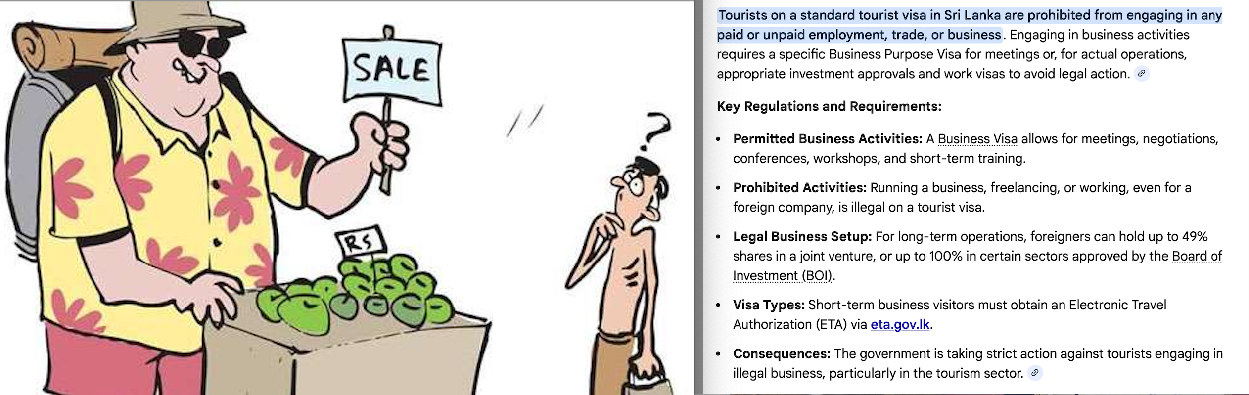 Under Sri Lankan law, a tourist visa does not permit employment or business operation. Foreign nationals wishing to operate enterprises must obtain appropriate investor visas, BOI approvals, or company registrations.