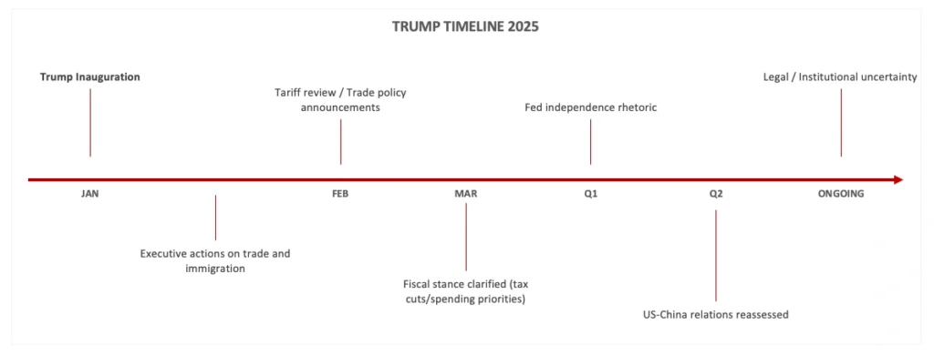 And then there’s the Trump factor: Politics has mattered less as a clean directional driver for the Dollar and more as a source of recurring volatility. As the timeline below shows, periods of heightened policy or geopolitical uncertainty have typically been moments when the currency benefited from its safe-haven role.