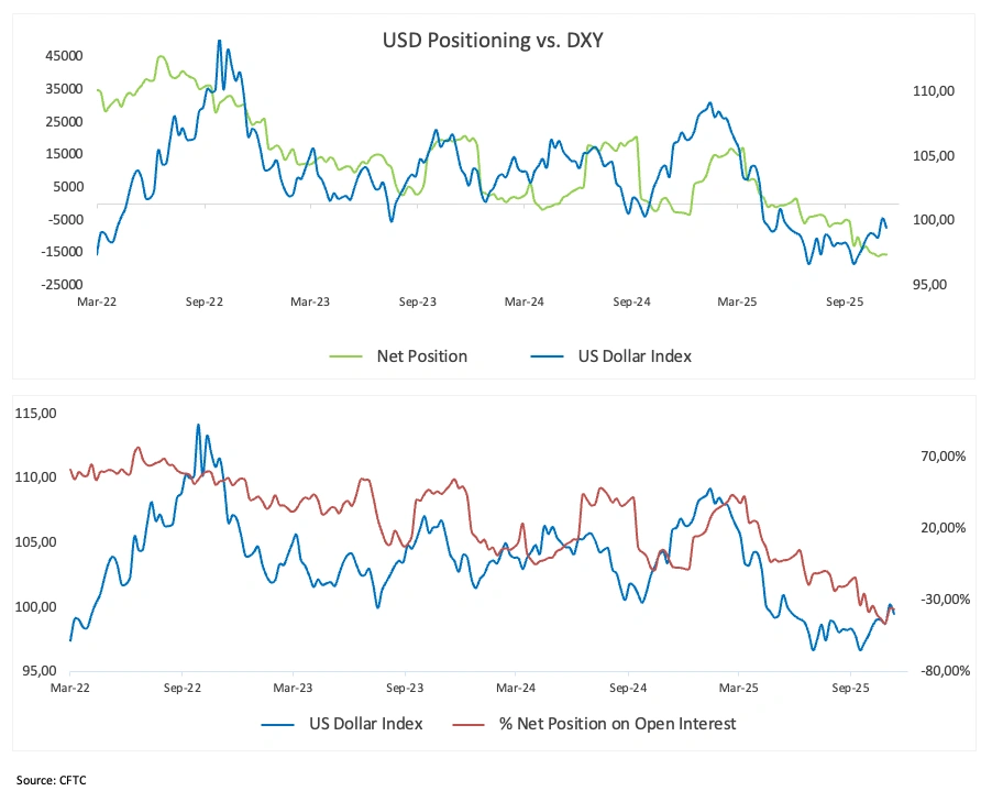 Positioning tells a more intriguing story: Speculative positioning has swung decisively, with USD net shorts now sitting at multi-year highs. In other words, a meaningful portion of the market has already positioned for further Dollar weakness. That does not invalidate the bearish case, but it does change the risk profile. With positioning increasingly one-sided, the hurdle for sustained USD downside rises, while the risk of short-covering rallies grows.