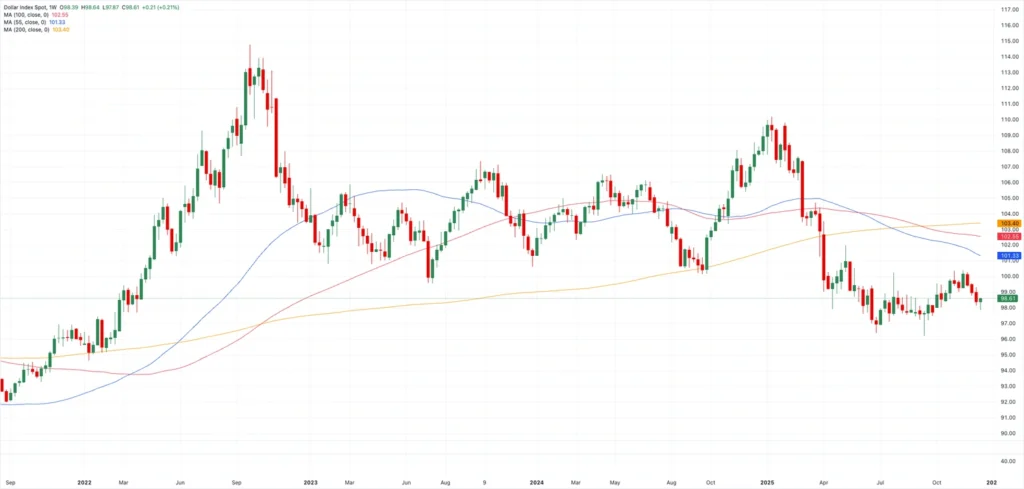On the downside, the first real area to watch sits around the 96.30 region, roughly three-year lows. A clean break below that zone would be meaningful, bringing the long-term 200-month moving average just above 92.00 back into play. Below there, the sub-90.00 area, last tested around the 2021 lows, would mark the next major line in the sand.